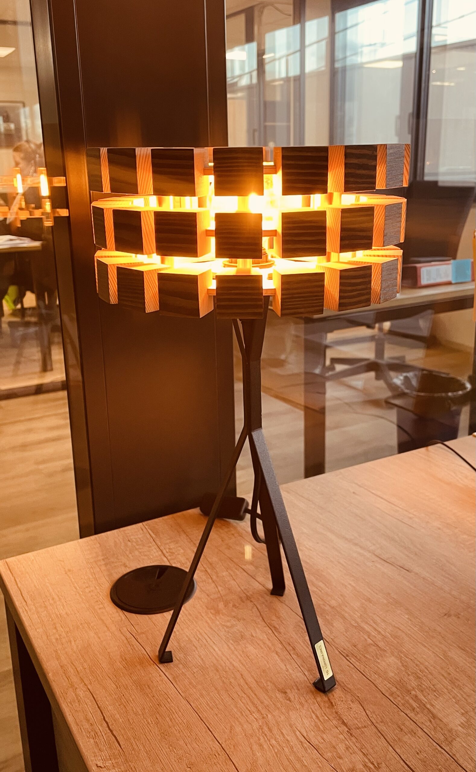 Cette lampe apporte tout de suite une ambiance chaleureuse par la profondeur et les reflets de la lumière sur le bois.